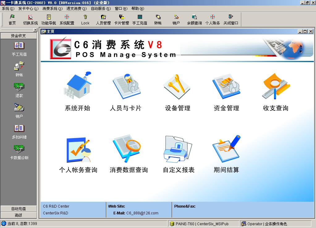 C6消費(fèi)管理系統(tǒng)是一個(gè)采用感應(yīng)式IC卡(或ID卡)為消費(fèi)媒介的智能收費(fèi)系統(tǒng),主要由計(jì)算機(jī)、收費(fèi)機(jī)、收費(fèi)管理軟件、發(fā)卡器、打印機(jī)和其它的輔助設(shè)備等組成。消費(fèi)后計(jì)算機(jī)可立即對(duì)各種消費(fèi)進(jìn)行匯總、統(tǒng)計(jì)、打印報(bào)表,便于部門進(jìn)行成本核算。使用本系統(tǒng)能夠徹底改變食堂、餐廳、購(gòu)物中心、商場(chǎng)等的人工收費(fèi)方式,提高了管理工作的準(zhǔn)確性,同時(shí)也避免了各種人為因素造成的誤差,實(shí)現(xiàn)了就餐、購(gòu)物電子貨幣化,操作簡(jiǎn)單方便,運(yùn)行安全可靠,大大提高了管理的現(xiàn)代化手段。